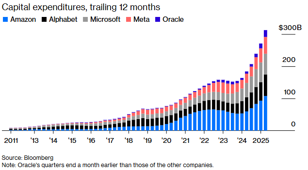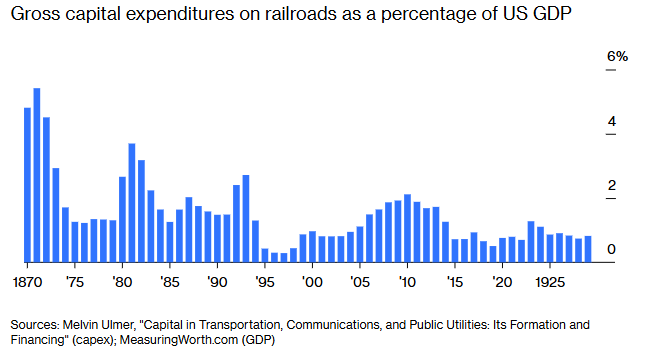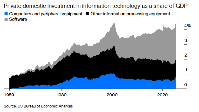 Source: Justin Fox via Bloomberg: https://www.bloomberg.com/opinion/articles/2025-10-08/the-ai-spending-boom-is-massive-but-not-unprecedented