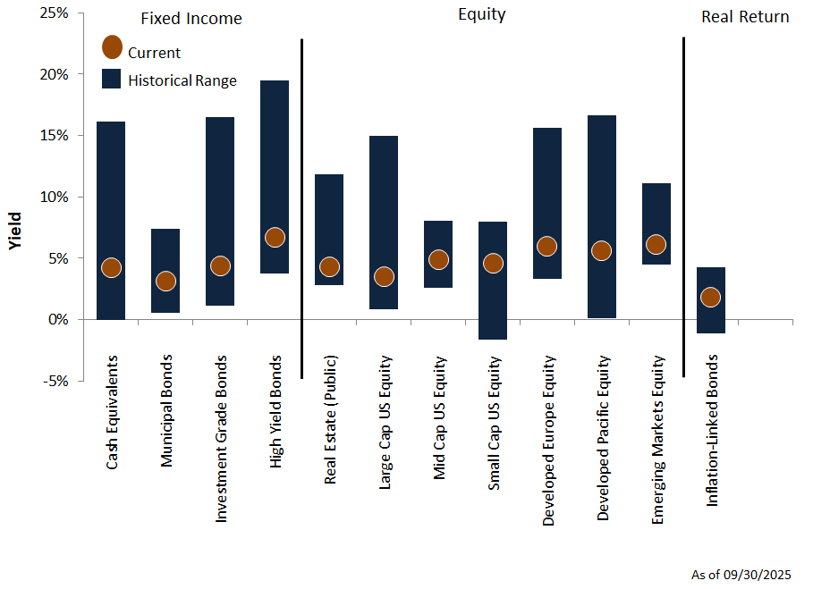 Yields are an indicator of future returns. Orange dots show current yields, blue bars show historical ranges.