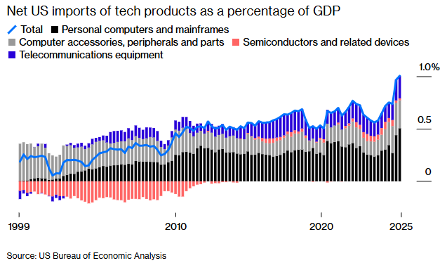 Artificial Intelligence (AI) investment has dominated the financial headlines over the past year. We previously noted the dominance of the Magnificent 7 stocks in our December 2024 note, but wanted to take a deeper dive to see how large the AI buildout stands on a historical basis. Outlined by Bloomberg, the charts below show the scale of the AI build out. The first chart below looks at private domestic investment in IT as a percentage of GDP. This figure currently stands at 4.4%, just below the 4.6% peak that was witnessed at the end of 2020. Assuming the growth trajectory remains, we will exceed the previous high water mark by the end of the year. Estimates of the $300 billion in capital expenditures on AI data centers hovers around 1.3% of GDP. This is up from 0.8% of GDP last year and 0.3% in 2023. To put in historical context, this compares to telecom Capex as 1% of GDP at the peak of the 2000 boom, but pales in comparison to the 6% portion of GDP that the railroad industry contributed in the late 1800s. Imports of technology-related products are also up to around 1% of GDP. The current figures range from 15% to nearly 50% of Capex for the 5 largest players in this industry. The investments are large but not unprecedented on a historical basis, but it is important to note that the investment is a large portion of Capex for the top players in this industry.5