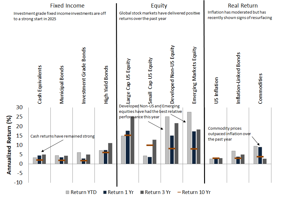 Historical market returns as of September 30th 2025. Note that looking backwards at recent returns is not a reliable method of predicting future returns.